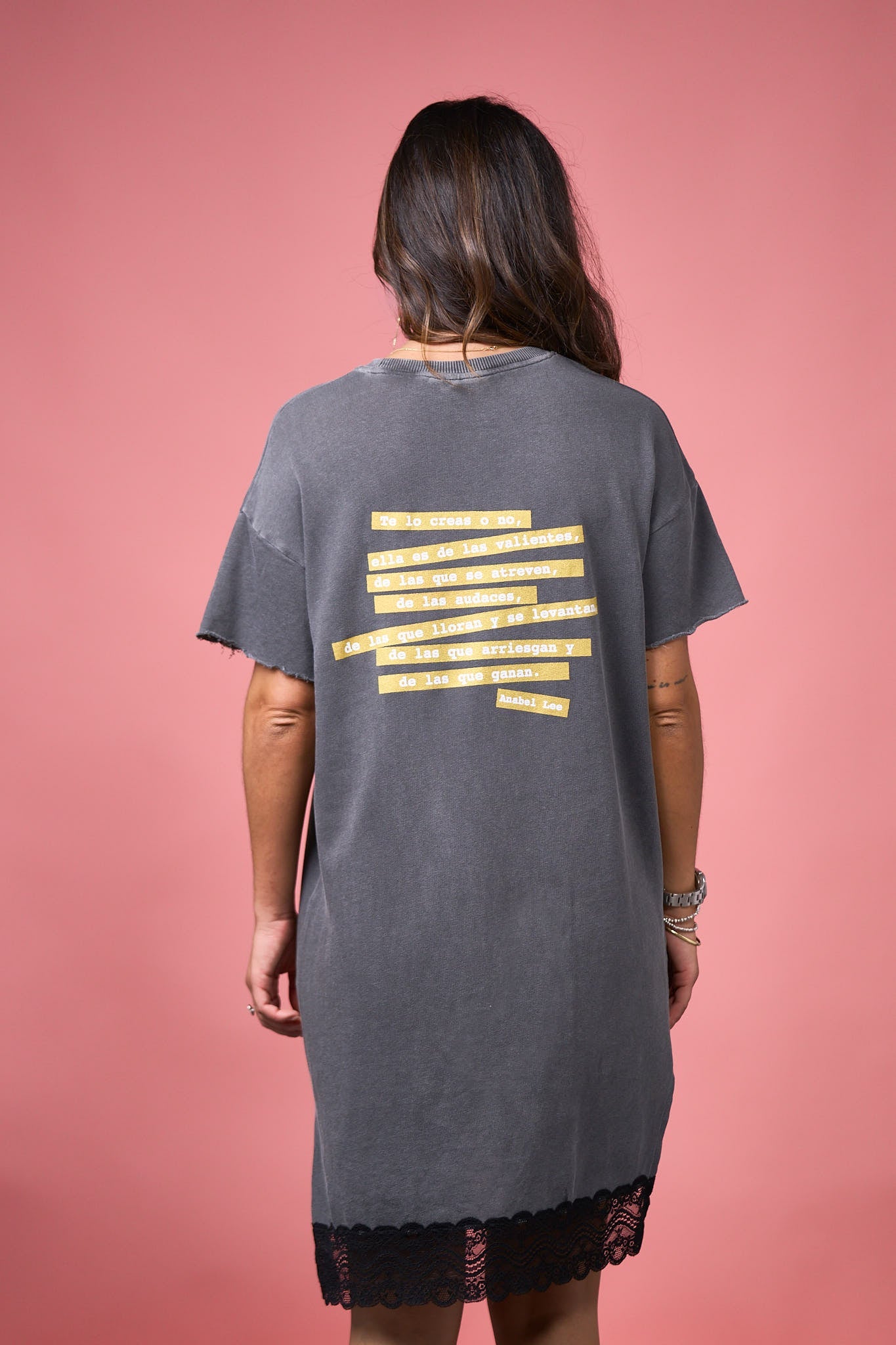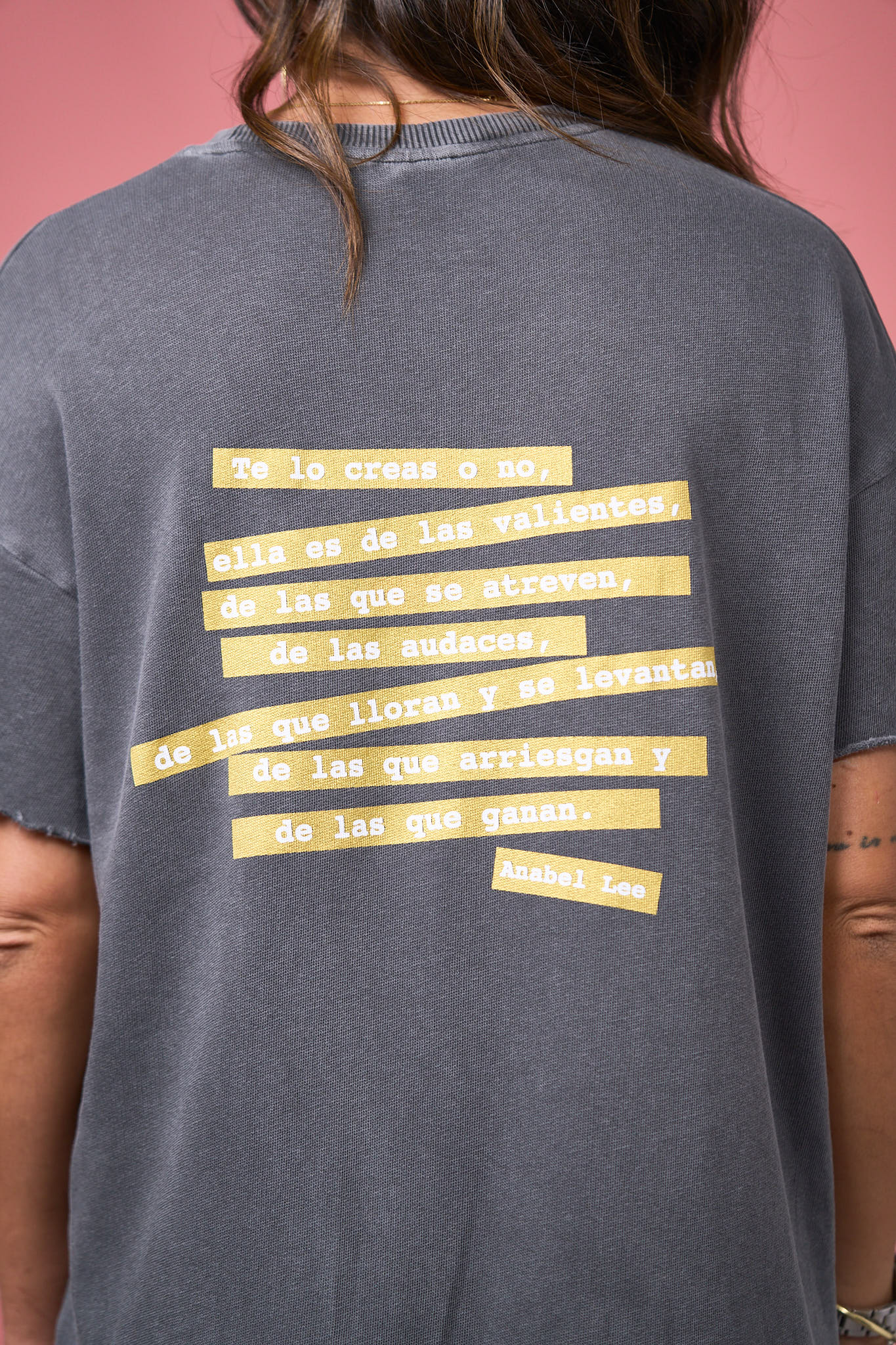 -Maxi print delantero y frase en parte de atrás con glitter dorado.